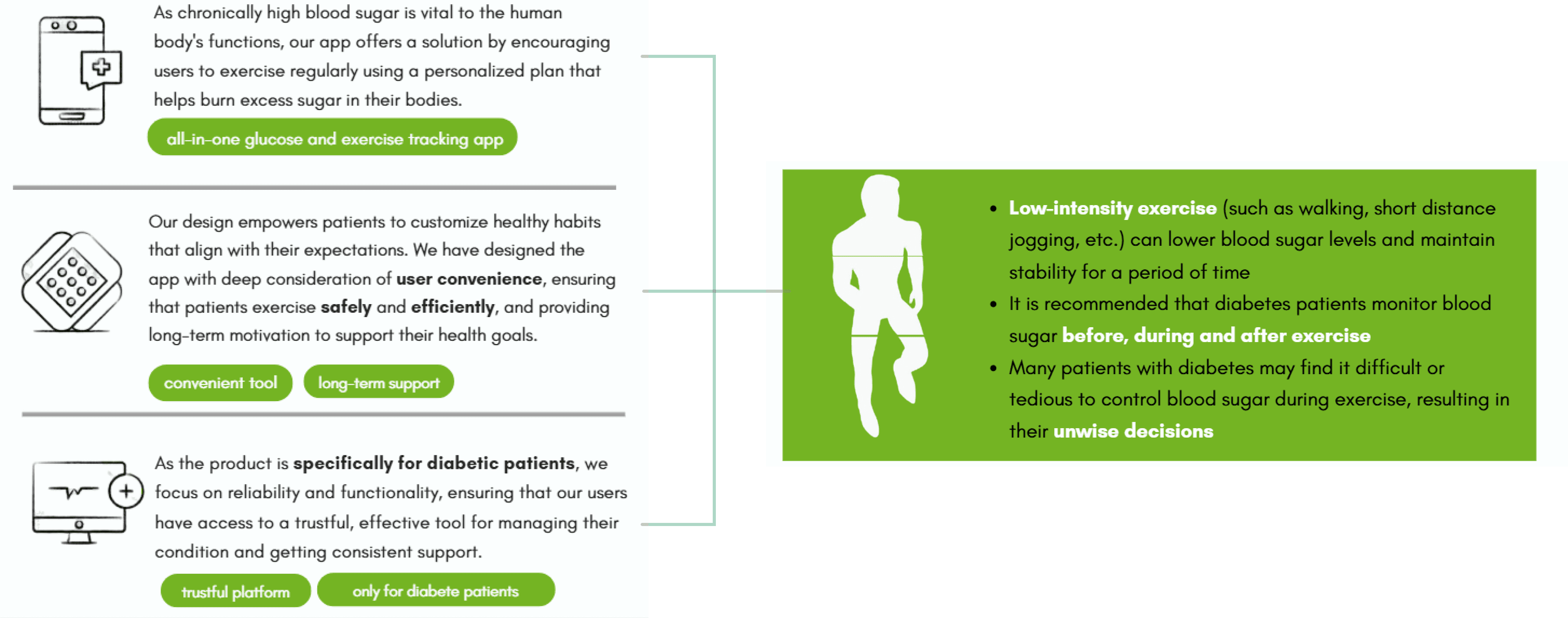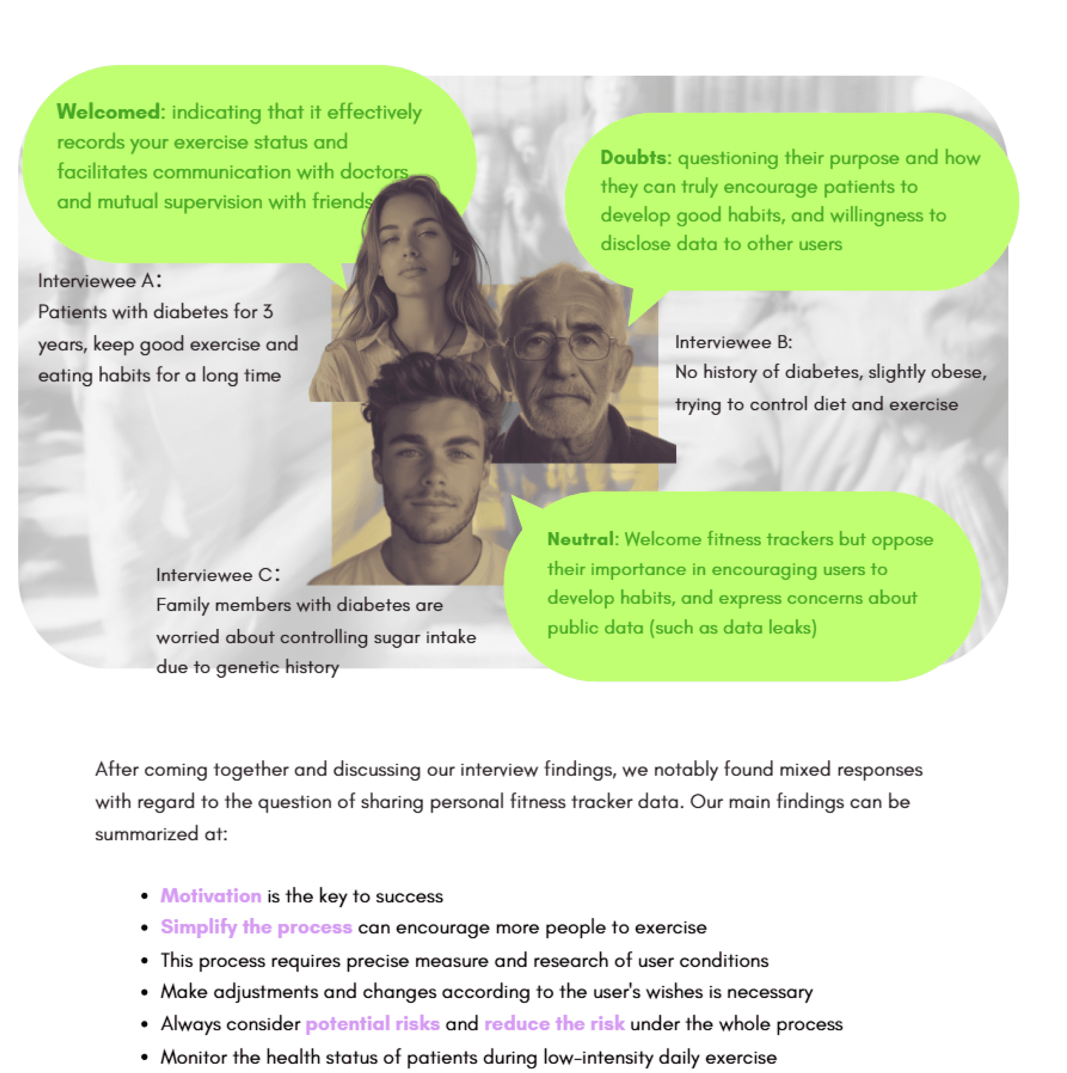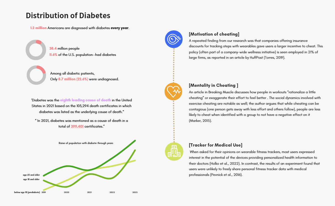 Rather than beginning with end goal-focused ideation, our team took the approach of researching different problem areas related to diabetc demographics in U.S., we found out that most of the diabetic users rely on fitness trackers to develop their rountines, but easily expose to the problem such as cheating and lack of professional guidiance.