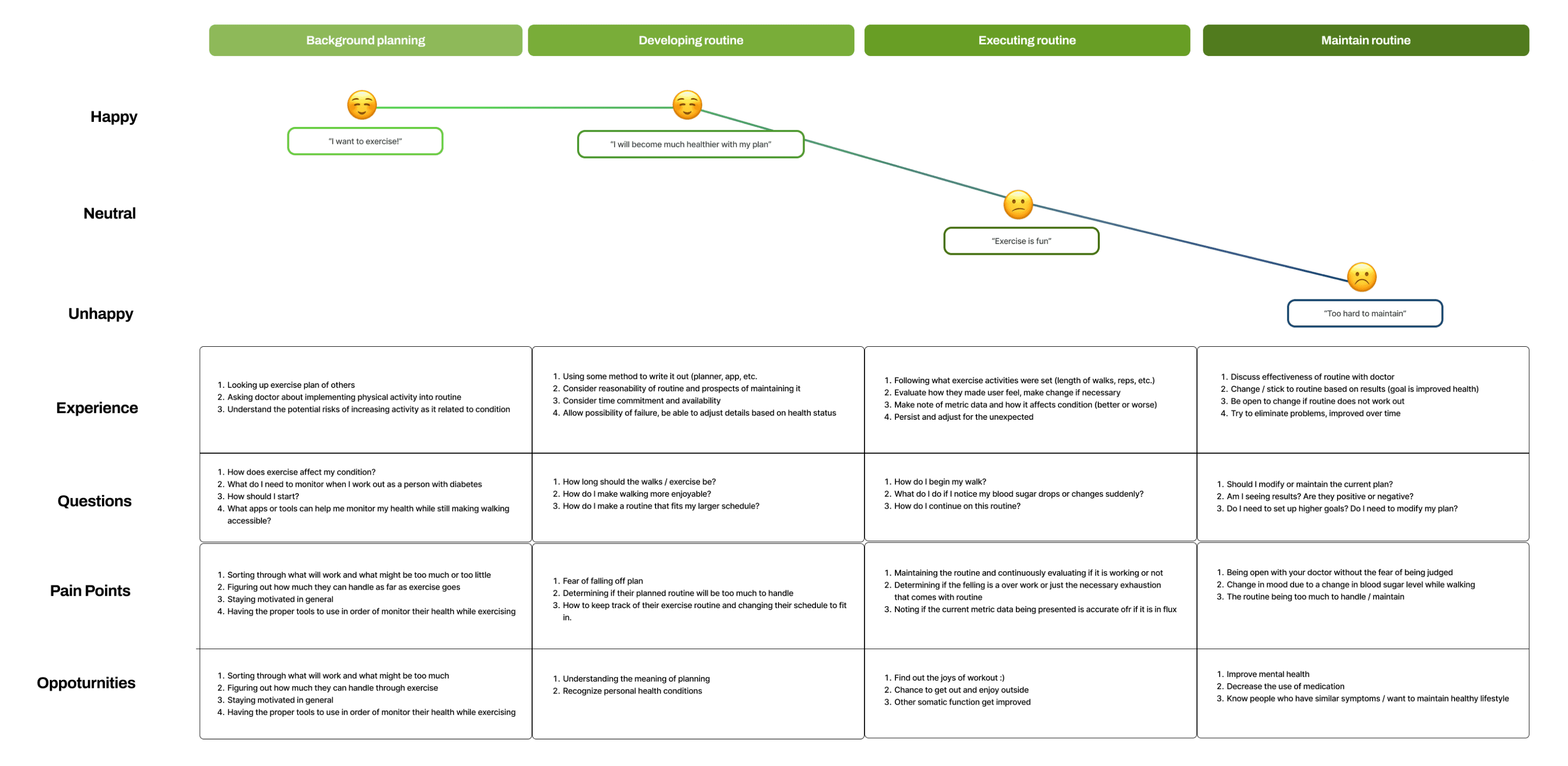 To further understand the needs of our user group, we constructed the activity theory diagram and mapped our user’s journey to get a deeper understanding of their needs throughout the stages of improving their health through an exercise routine.