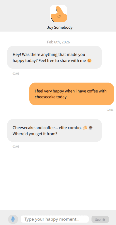 "Hello! I'm your Happiness Coach. Whenever you experience a moment of joy, feel free to tell me via voice message. I'll help you crack the code behind that happiness."