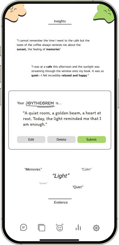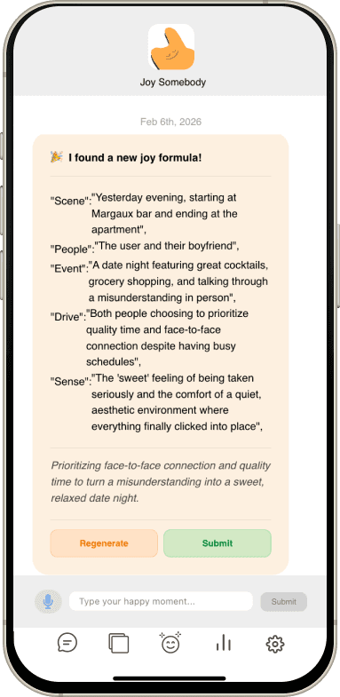 Voice-to-JSON. AI automatically transforms casual narratives into structured Joy Formulas. Minimal friction.