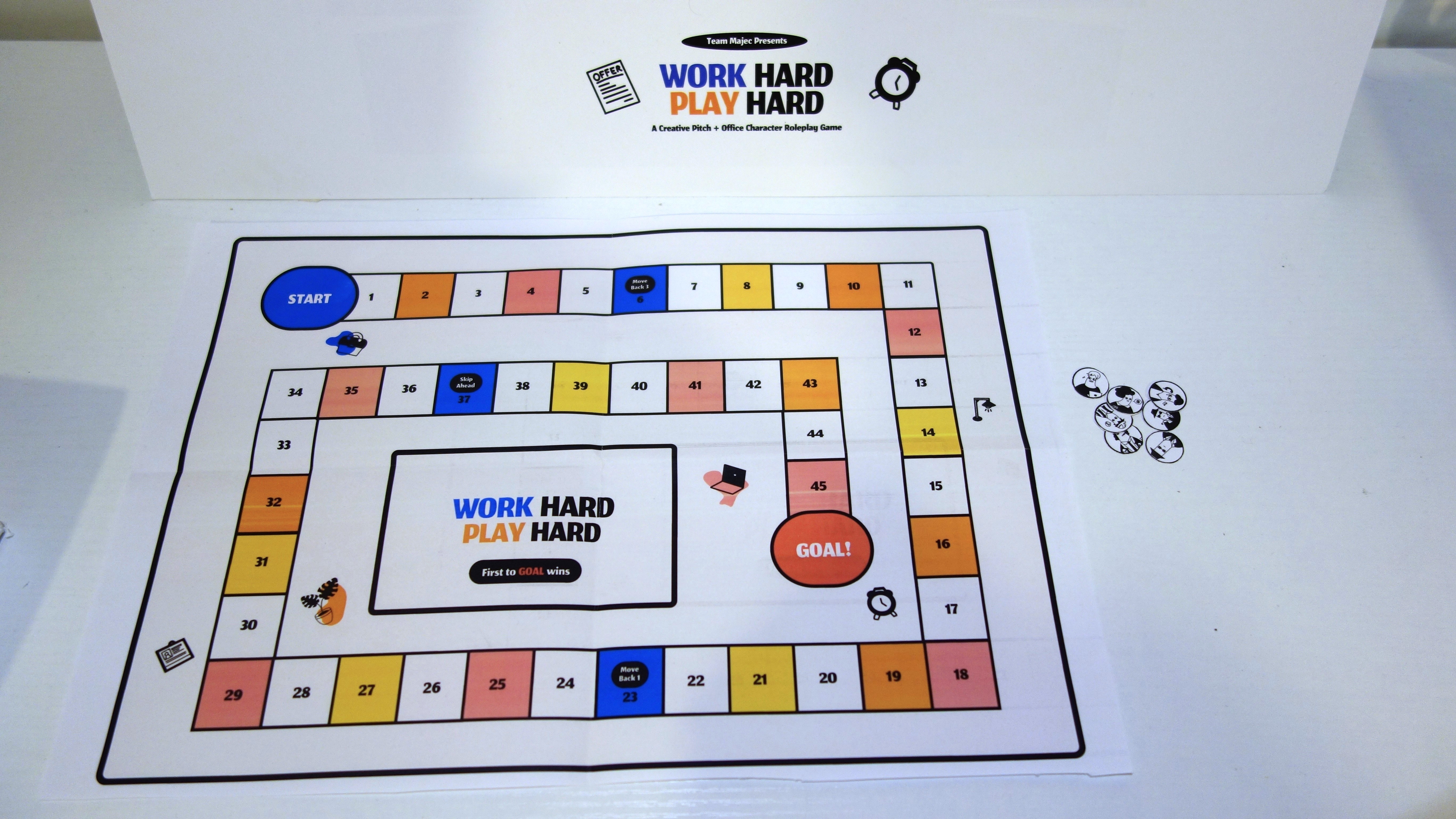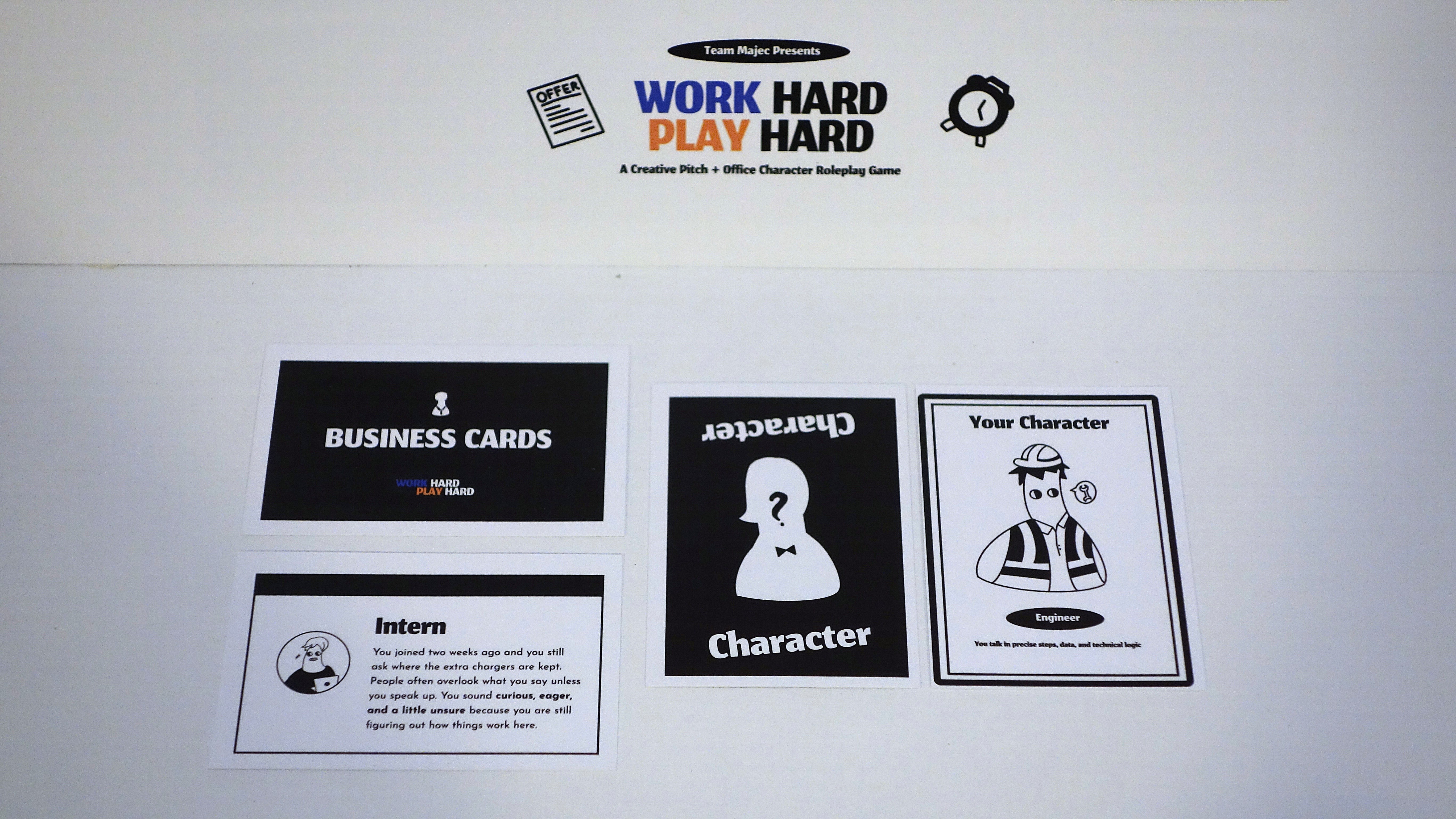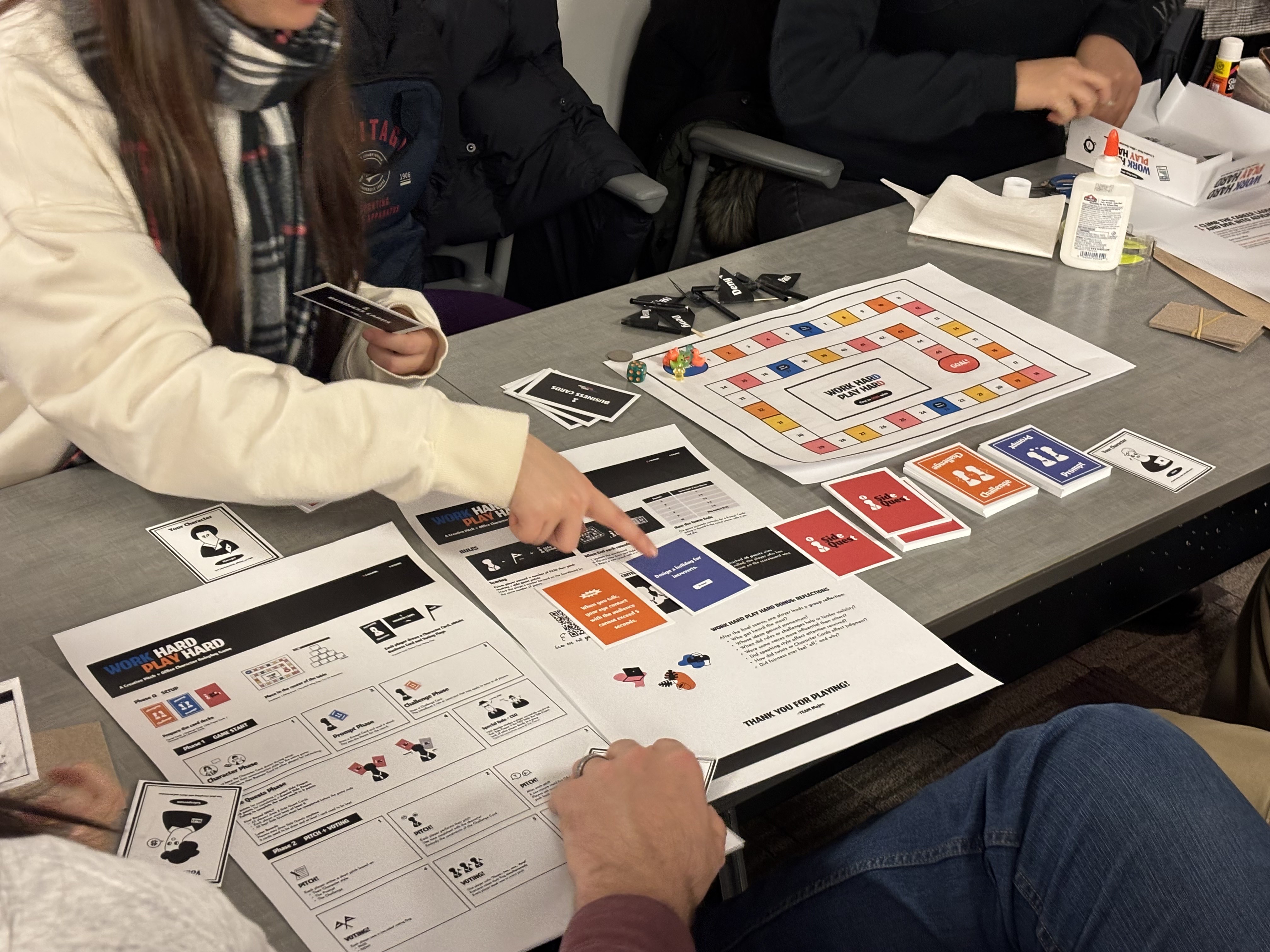 Work Hard, Play Hard is a board game designed to surface the subtle dynamics of implicit bias in professional environments. Since workplace judgments are often triggered by trivial, surface-level cues, the game embeds these stereotypes into core mechanics: players navigate challenges influenced by arbitrary attributes like footwear, hair length, or communication style.