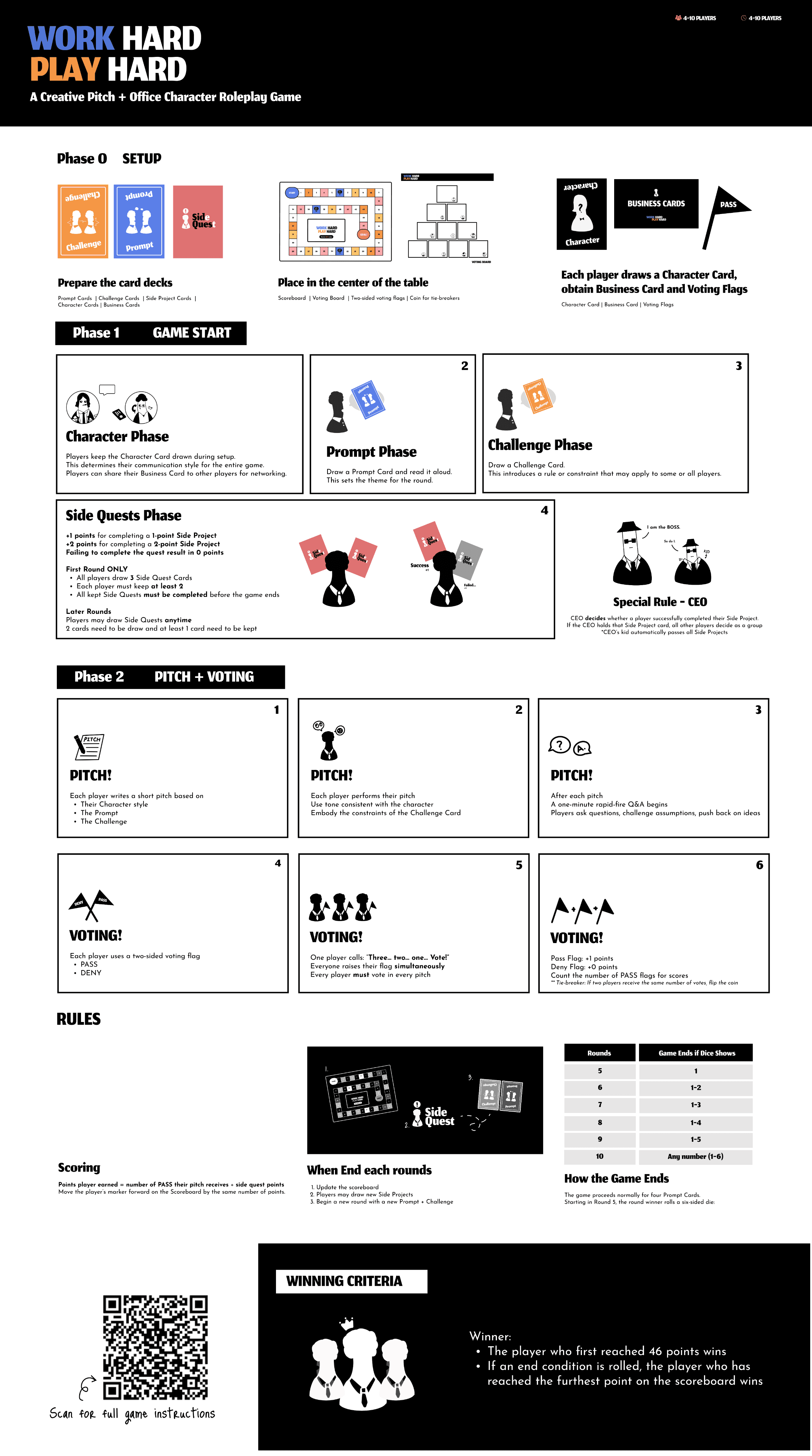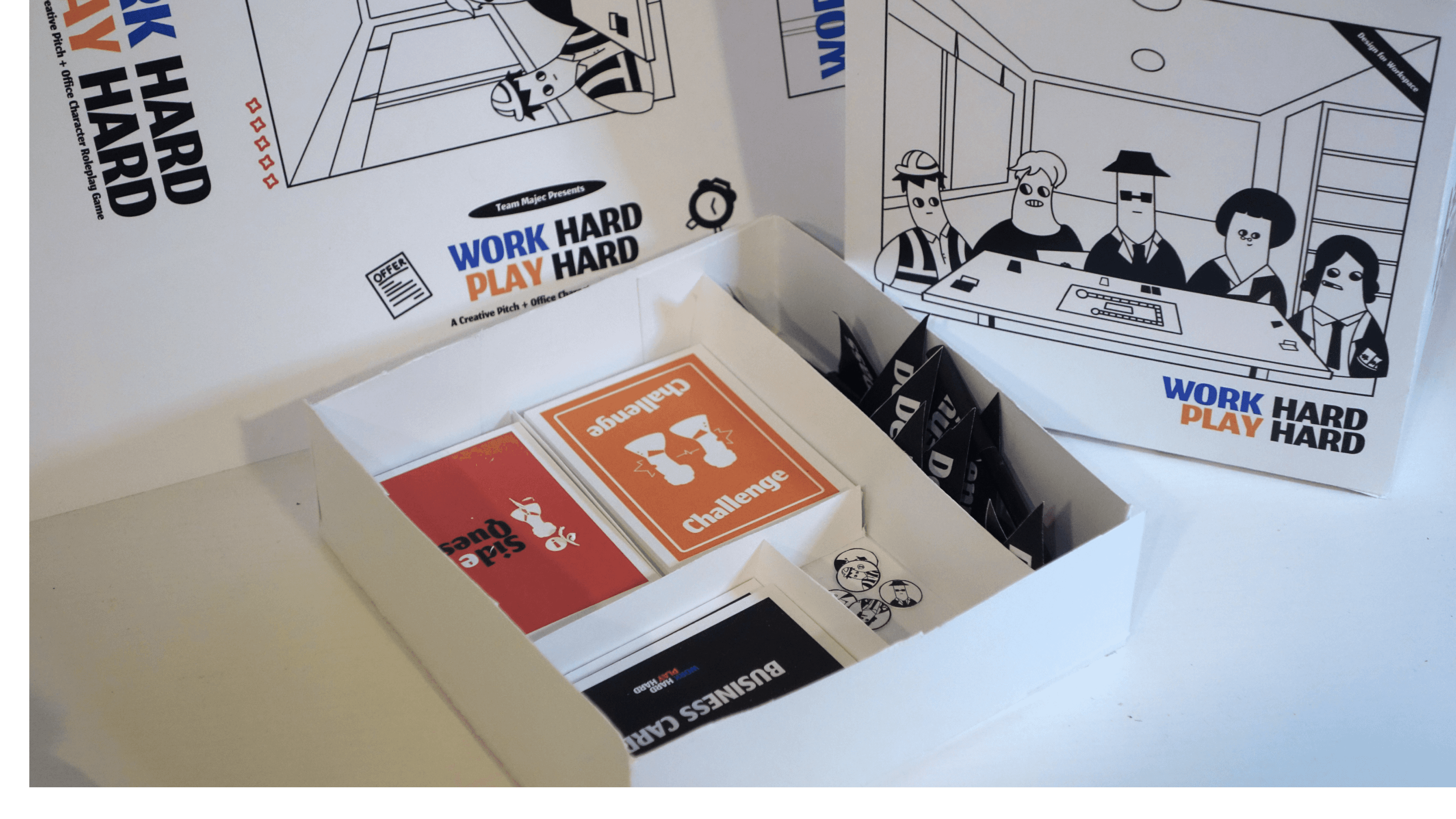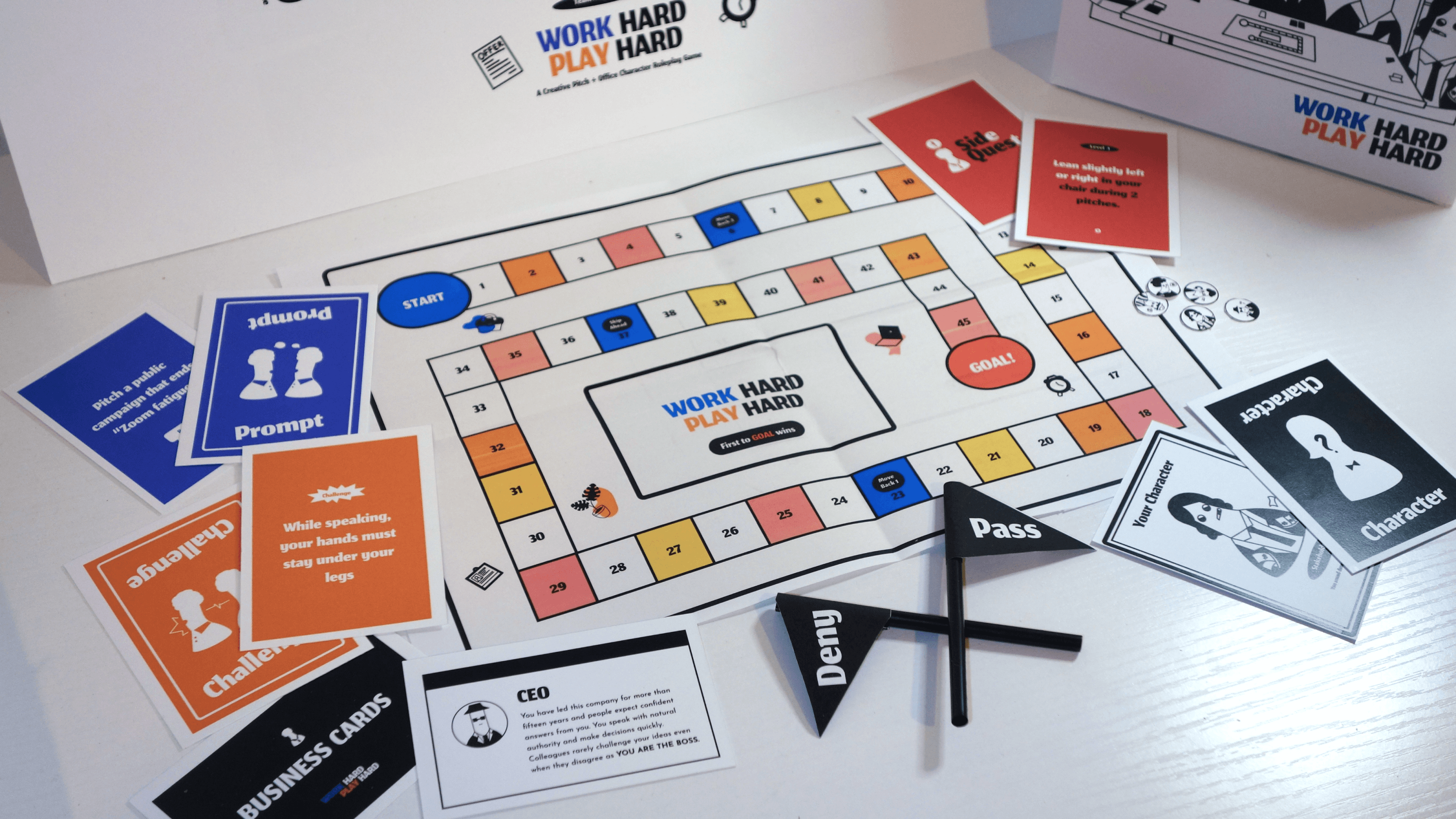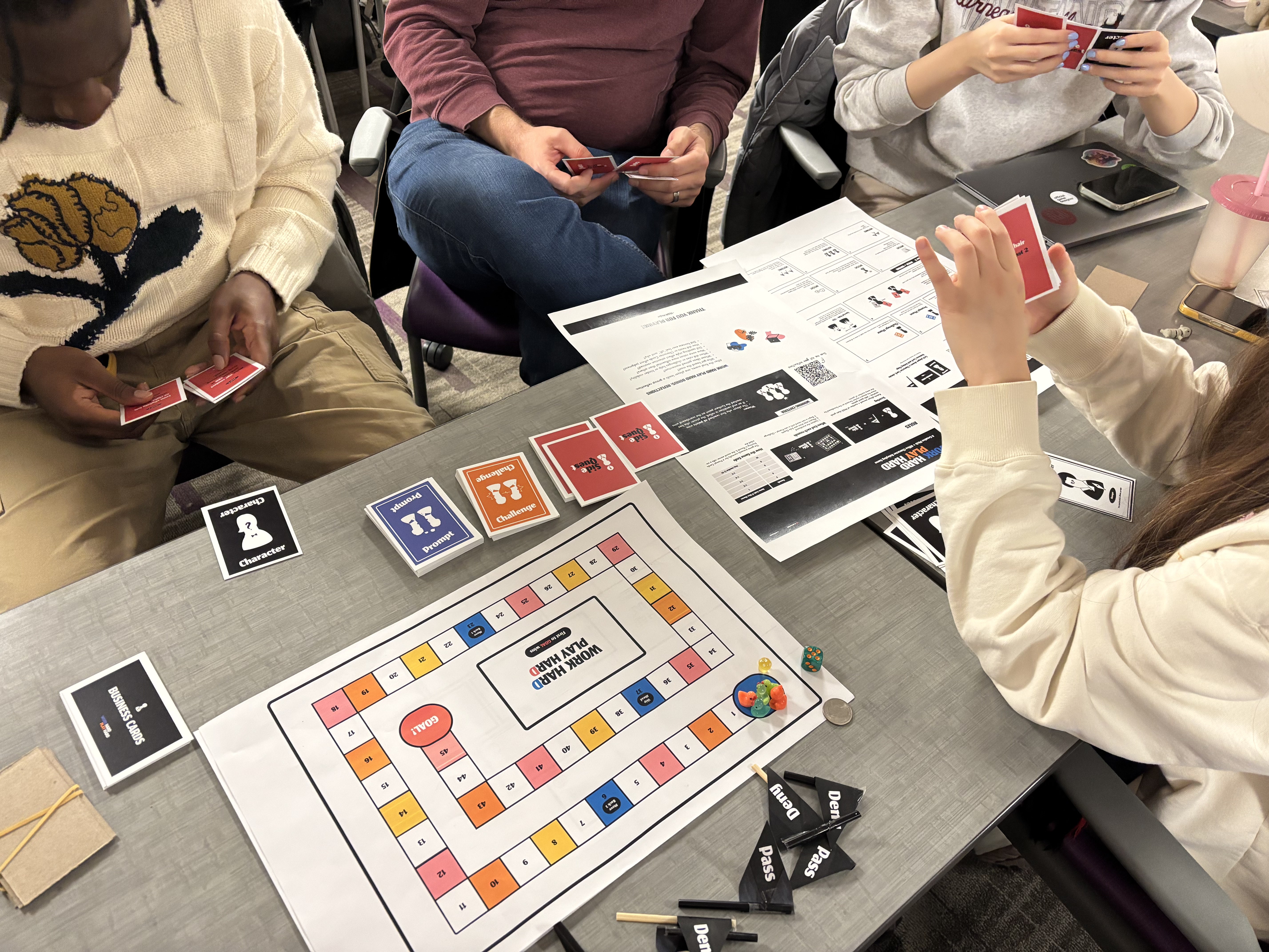 Work Hard, Play Hard is a board game designed to surface the subtle dynamics of implicit bias in professional environments. Since workplace judgments are often triggered by trivial, surface-level cues, the game embeds these stereotypes into core mechanics: players navigate challenges influenced by arbitrary attributes like footwear, hair length, or communication style.