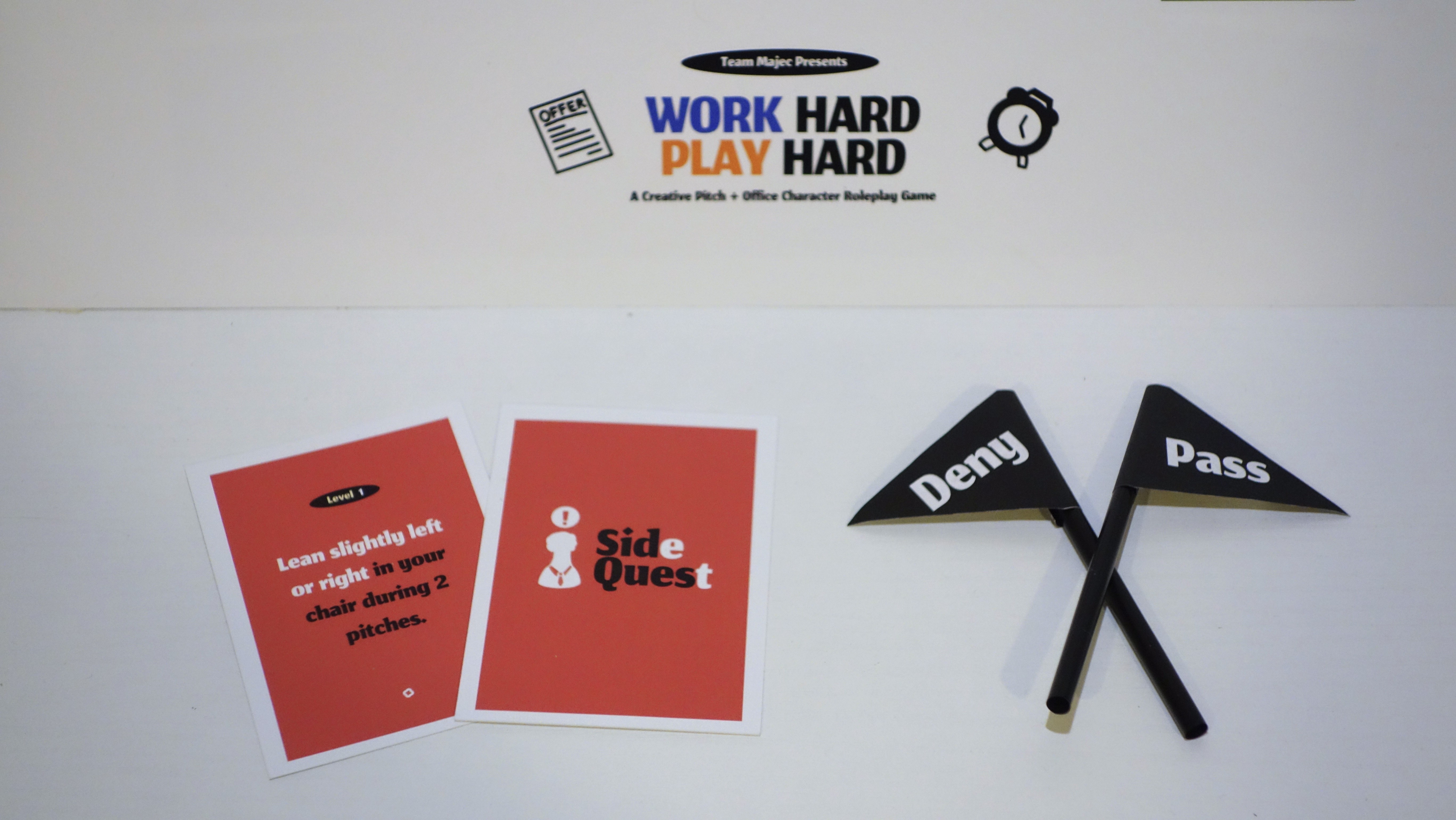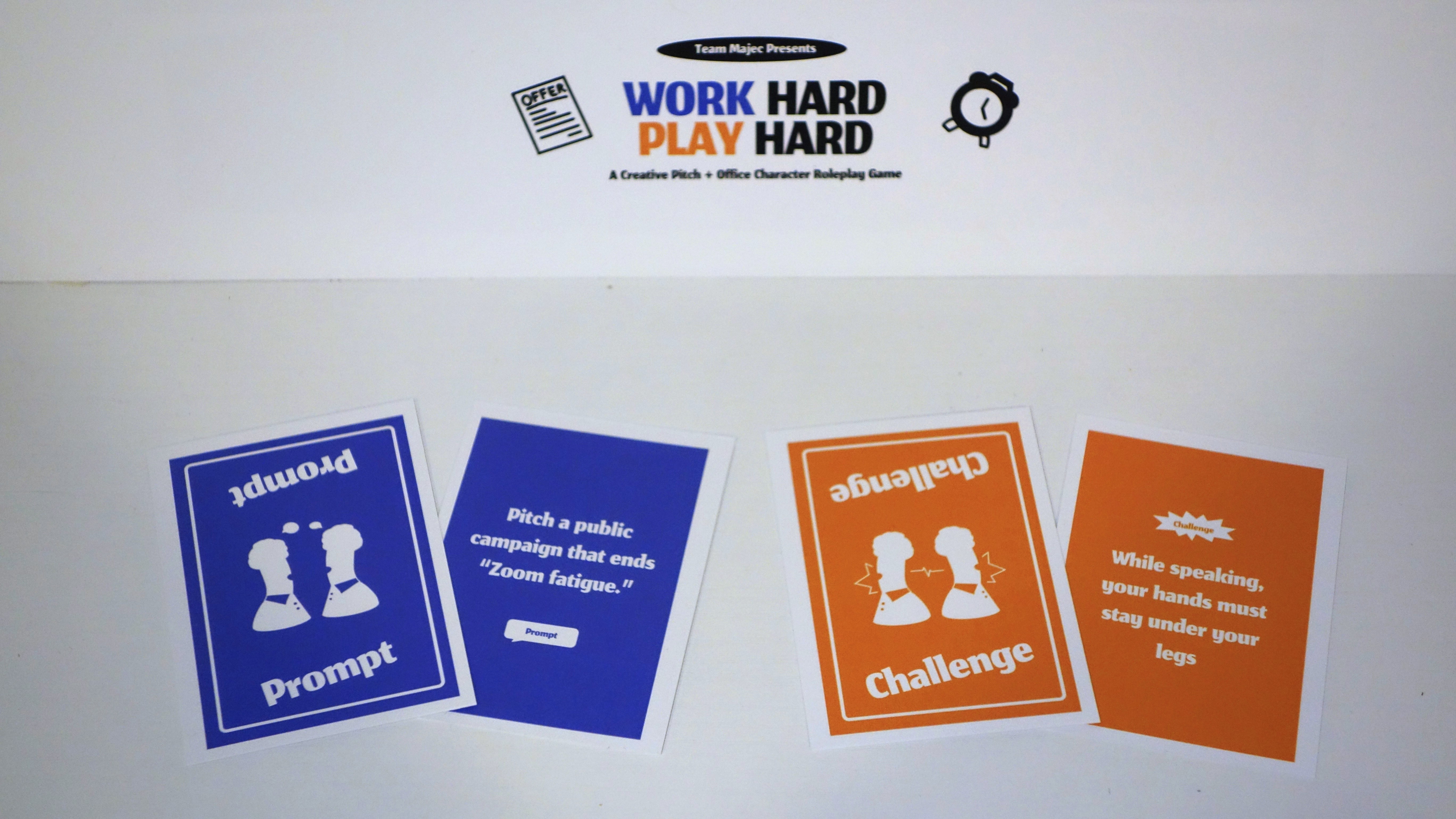 We create our initial prototype ‘Spotlight’ which convey the sense of “being spotlighted”. A host will set the pitch topic with a Prompt Card about its content and a Challenge Card about specific constraints. Individuals will write their pitches and give them to the host, which the Host performs for anonymous voting using Spotlight flags.